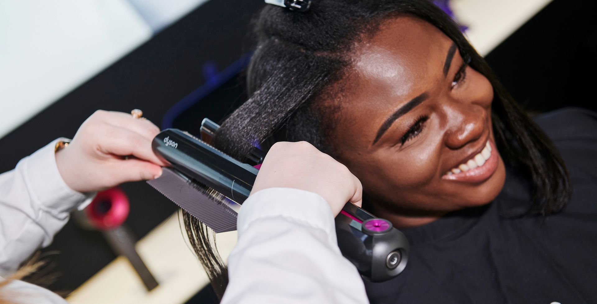 Единственный стайлер для волос с мотором Dyson Hyperdymium. Благодаря мощному направленному потоку воздуха он гладит и упрямляет волосы.